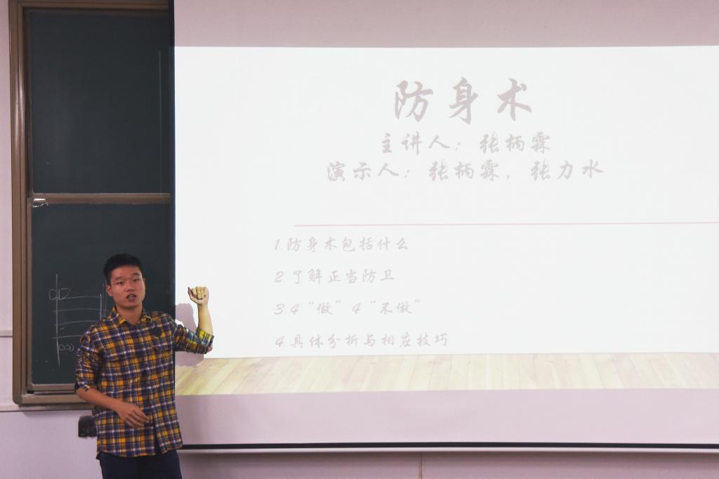 张柄霖分别从防范、防卫两方面介绍仙女自救防身术。在防范方面,他提醒女生保持警惕和注意周边环境,尤其是注意夜间出行安全。在防卫方面,他向参加讲座的同学介绍正当防卫的正确范围。他表示,防卫要做到"四做",做到风险降级、武力压制、逆境反射、体能训练;"四不做":不挑衅、不控制、不对攻、不纠缠。