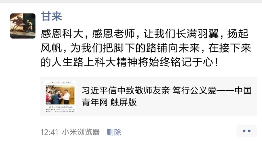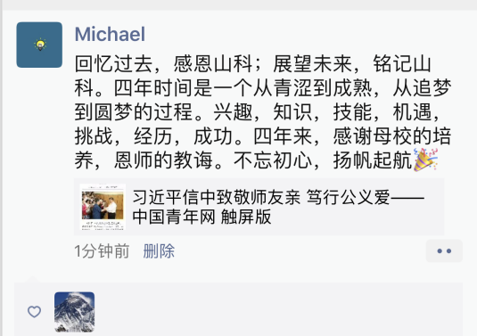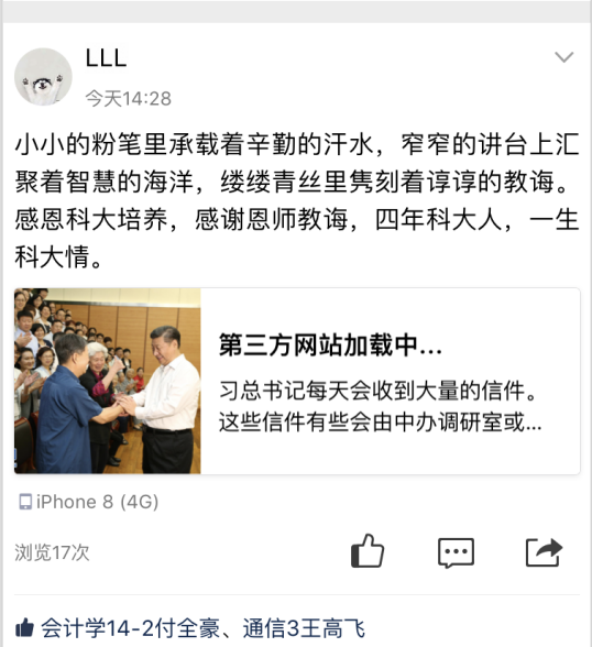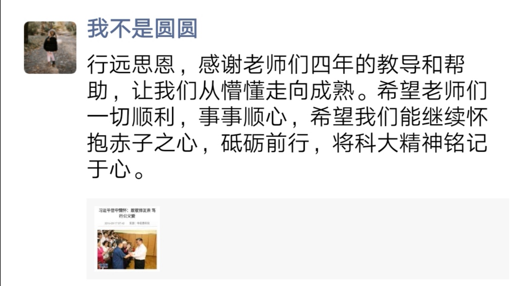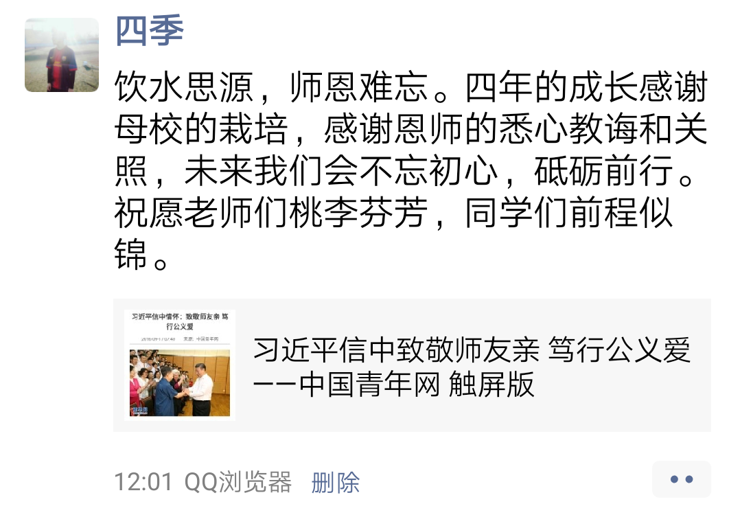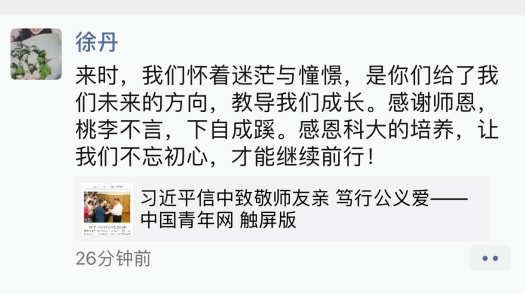 为弘扬中华民族尊师敬教的优秀传统,传承财经学子感恩反哺的校友情怀,举办“奉献青春,感恩母校”主题党日活动,集体学习《习近平写给老师的“五封信”》,“关键词”发言模式发表个人感受和看法。通过自学《习近平信中情怀:致敬师友亲 笃行公义爱》、《尊师敬教之风要代代传承》文章,转发并撰写感受发布说说或朋友圈,弘扬网络正能量。通过“我与恩师的故事”分享会,每位毕业生党员总结自己四年中在老师们教诲下的感悟和改变,把对老师的感谢祝福语写在卡片上并赠予老师,以此感谢老师的悉心指导以及这四年的关心照顾。活动结束后,毕业生党员将“我与母校有个约定”写到卡片上,贴至503办公室门口公告栏。