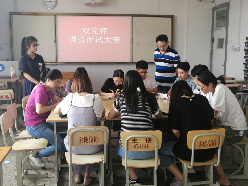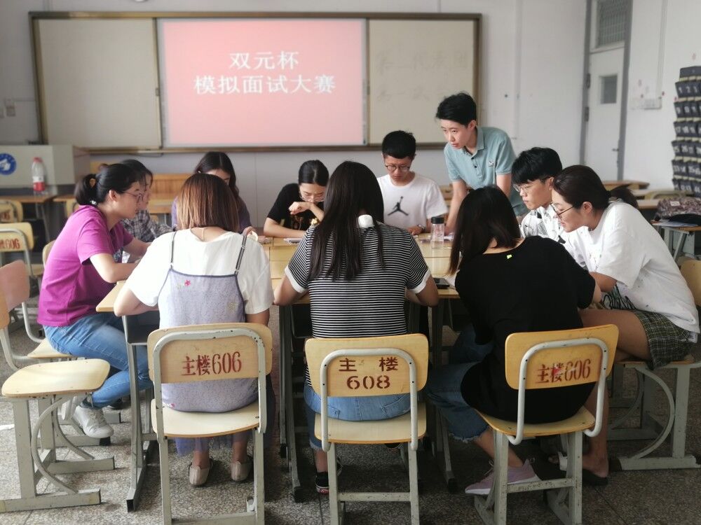 作者:王红红 发布时间:2019-09-09为了提高同学们的面试技巧,提高职场竞争力,9月6日,财经系会计学2016级全体学生进行了一场无领导小组讨论的模拟面试。本次面试活动分为两组,分别在1-606和1-610两个活动教室举办,双元教育拥有多年面试工作经验的老师马艳青、赵书峰、吕彬彬、张玮华、耿文超、王红红担任评委。