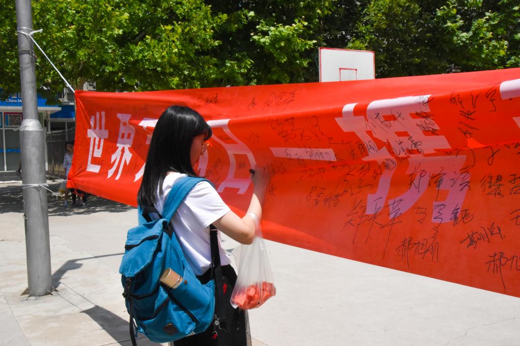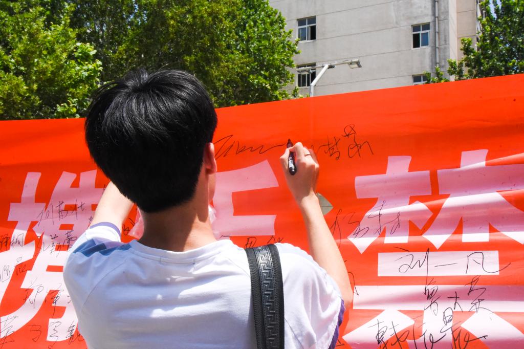 吸烟和二手烟都会严重危害人类健康,而烟草危害已成为世界最严重的公共卫生问题之一,并亟待解决。5月31日中午,自律部成员们在小操场上进行了禁烟宣讲,并拉起“世界无烟日——携手禁烟 共创文明”的条幅,路过的同学纷纷在条幅上签名,表达了禁烟的倡议。