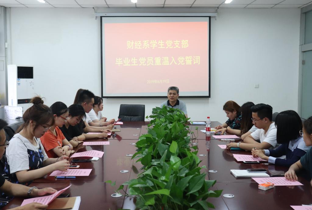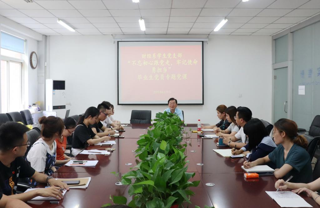 作者:文编:崔涵 摄影:鞠孝刚 发布时间:2019-06-21为进一步提高毕业生党员党性修养,强化党员意识,6月19日下午,财经系于3-316会议室举办“不忘初心跟党走,牢记使命勇担当”专题党课、重温入党誓词活动。本次活动由财经系党总支书记宋伯涛担任主讲,校区党委工作部陈新老师带领毕业生党员重温入党誓词,财经系2019届毕业生党员参加。