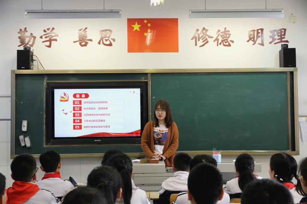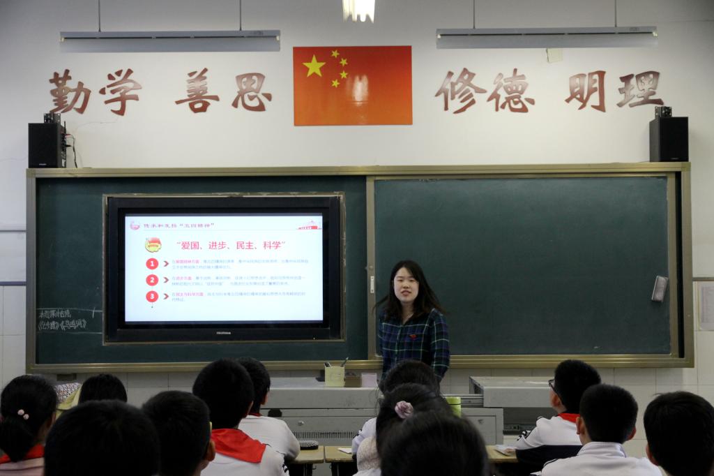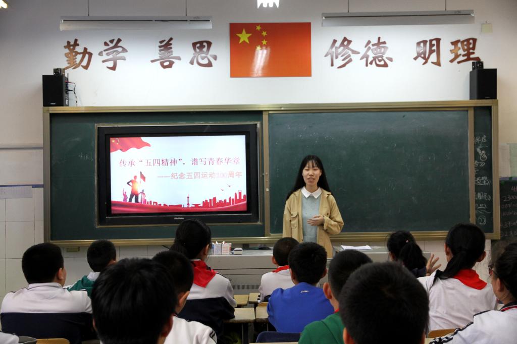 近日,财经系学生党支部联合财经系青年志愿者协会在堤口路小学六年级开展了“四点半课堂”——纪念五四运动一百周年微党课宣讲活动,陈晨、常慧杰、张梦雨、徐秋媛、徐丹五位学生党员担任主讲。