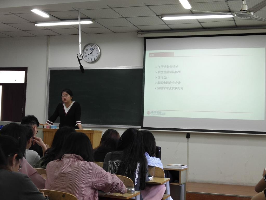 作者:文编:刘茉竹 发布时间:2019-05-15为拓展金融会计相关内容,引导学生应用实践理论知识,5月10日上午,财经系于3-323举办“会计学在金融企业中的应用”专题讲座。本次讲座邀请中信证券(山东)责任有限公司区域总监李琳主讲,2017级金融专业全体学生参加。
