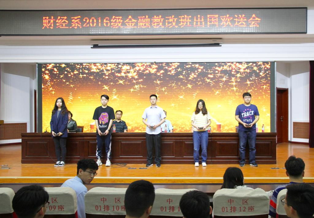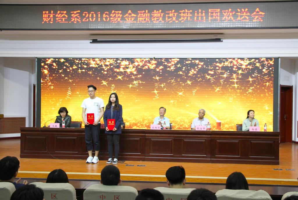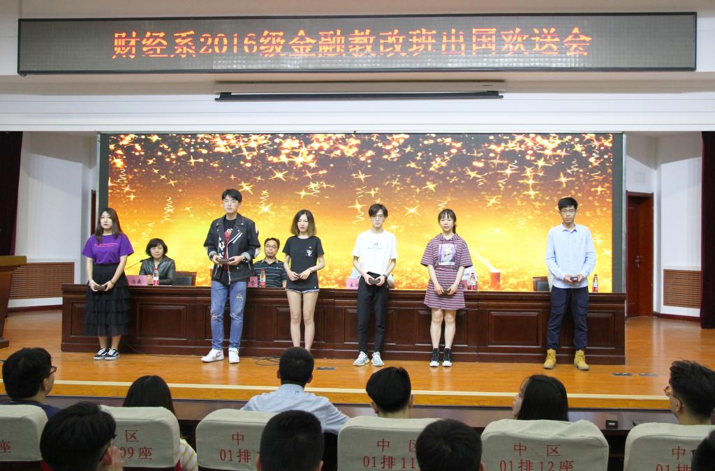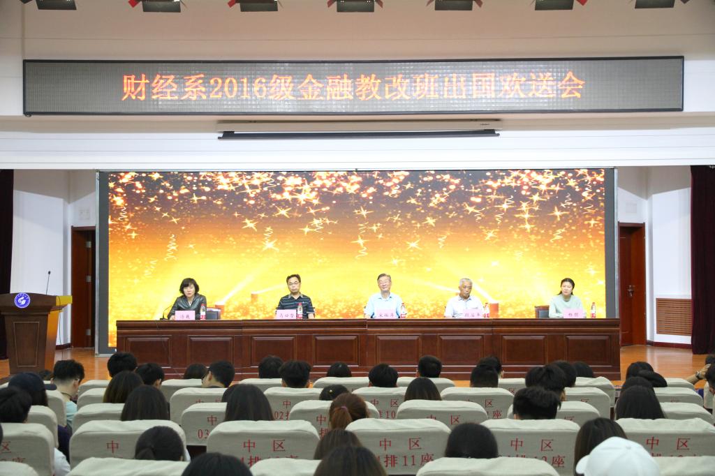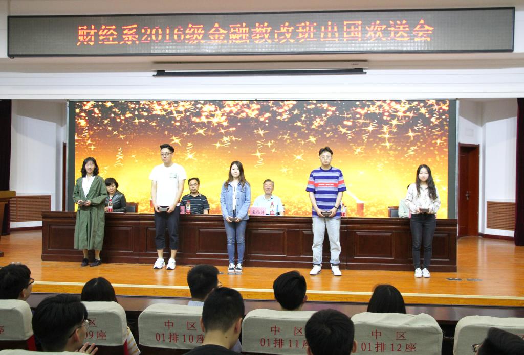 作者: 文编:刘茉竹 摄影:刘文栋 发布时间:2019-05-175月15日下午,财经系于图书馆报告厅举办2016级金融教改班出国欢送会。欢送会由金融教研室主任汤巍主持,财经系党总支书记宋伯涛、系主任段治平,校区教务科科长马曰坚,合作办学办公室杨朋老师,财经系团总支书记袁玉磊,辅导员张绍琦及金融教研室教师代表孙磊、公雪梅出席,2016级、2017级金融教改班,2018级金融专业全体学生参与本次大会。