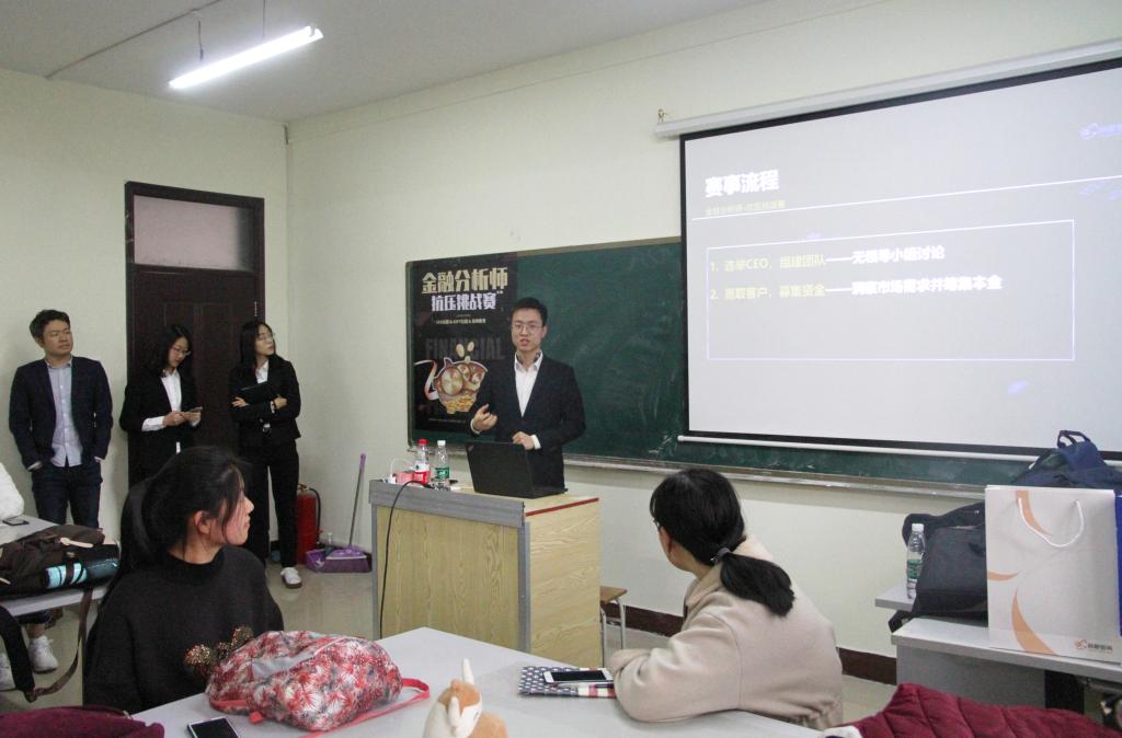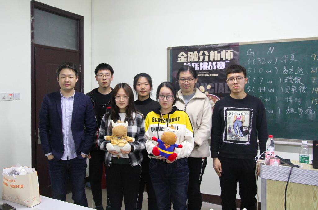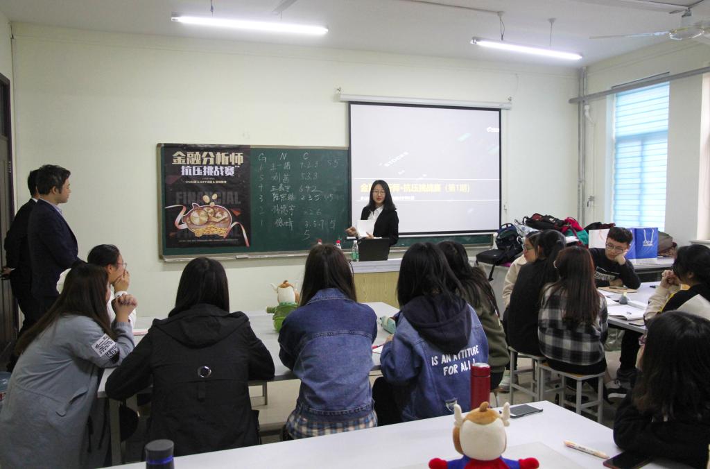 为加强同学们对金融风险的认识,进一步了解金融产品和金融投资,4月3日下午,CFA社团、GIFTCLUB社团联合财经系学生会学习科技部特邀高顿财经于2-116共同举办金融分析师抗压挑战赛(第一期)。本次比赛由高顿财经苏哲新主持,CFA&FRM会员张宇进行指导。2017、2018级共36名同学参加本次比赛。