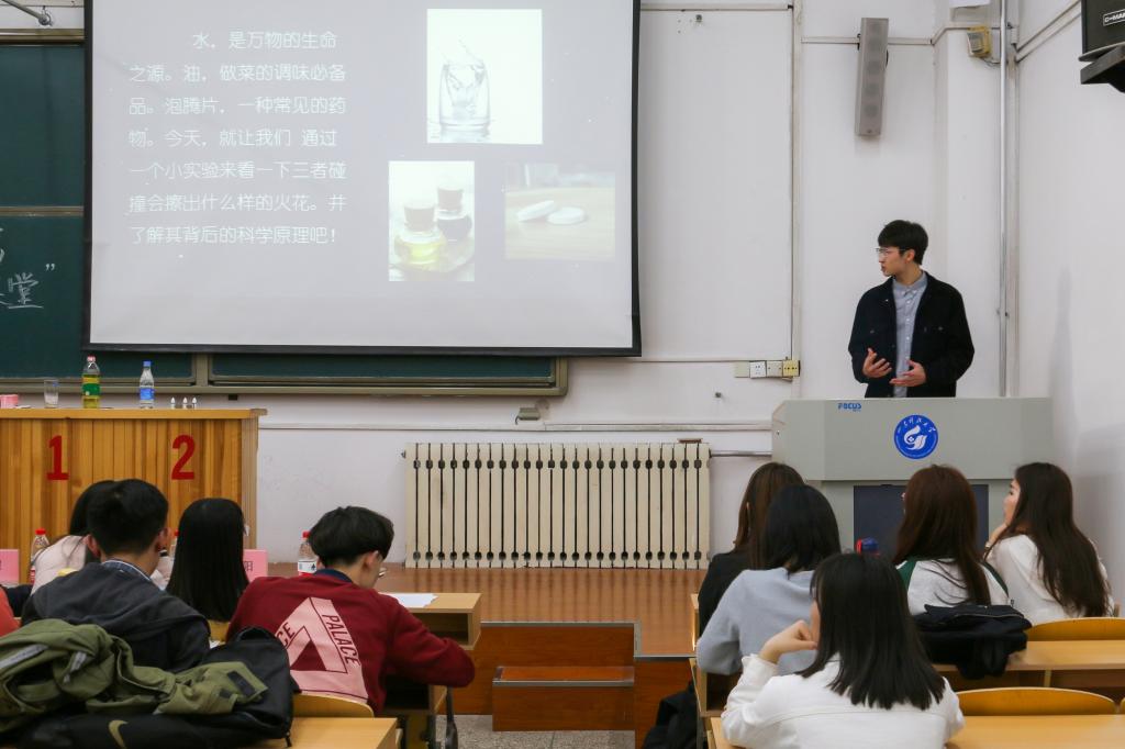 本次宣讲比赛以科学小课堂为主题,旨在增加小学生对科学文化的兴趣和对科学探索的热情,更好地助力他们健康成长。初赛的33组选手中,有11组选手脱颖而出进入决赛。参赛选手用通俗生动的语言讲述了静电、密度、折射等科学现象,并利用道具生动地演绎出来。赵明同学利用泡腾片、油和水为同学们展示了“火山喷发”;郑采苹组利用纸巾摩擦绳子,使绳子震动并带动周围空气以及纸杯的震动,向同学们讲述了振动发声的原理;吕东洋组则展现了“筷子折了”“鸡蛋漂浮”等现象。选手们在讲课过程中积极与评委、观众进行互动,让在场的同学都能近距离的感受到科学小实验的魅力。最后,各位评委根据参赛选手的宣讲情况进行打分,评选出一等奖两名,二等奖四名,三等奖五名。
