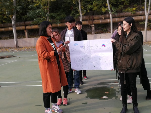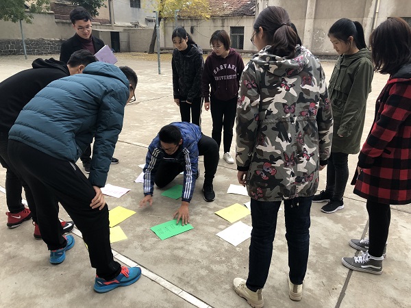 活动伊始,吕彬彬做简单发言,阐述活动目的。她将同学随机分为五个小组,分发白纸和彩笔,要求各组在20分钟内确定队长、设计队徽,进行简单交流。在按时准确地完成任务后,各组按抽签顺序上场进行才艺展示,五队各具特色,饱含青春活力。展示过后,吕彬彬向大家介绍游戏规则。第一个游戏在各组前方20米处摆放着13张卡片,各组接力跑,首先按顺序翻开数字1-13的小组获胜。各组讨论游戏对策,并展开激烈比拼,最后五组“无敌组”以最快的速度完成比赛,赢得胜利;接着两个游戏分别是“六人七足”和“搭桥过河”,在比赛过程中,同学们充满斗志,有的不断为队友加油打气,有的学生在旁指导协同比赛,经过激烈比拼,一组和五组分别获得胜利。活动最后,王红红为各组贡献最大的两位成员颁发“最佳个人奖”,吕彬彬作简单总结,她强调团队中最重要的是团结协作,将团体利益最大化,要求大家善于发挥团队精神,并将互帮互助等优良品质逐步带入到学习、生活中去。